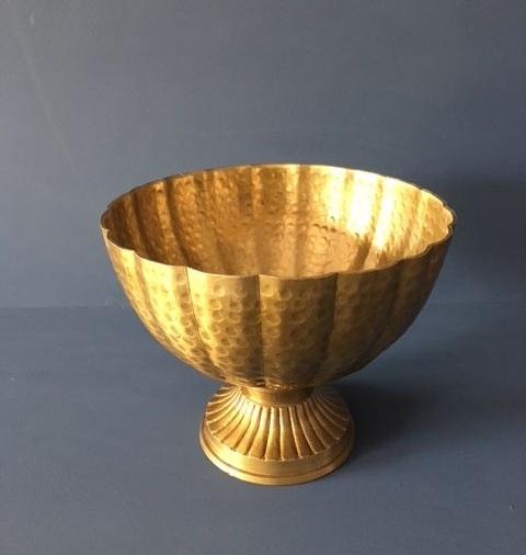 Decorative Brass Round Bowl with Pedestal Base Scalloped Edges and Intricate Floral Engraving