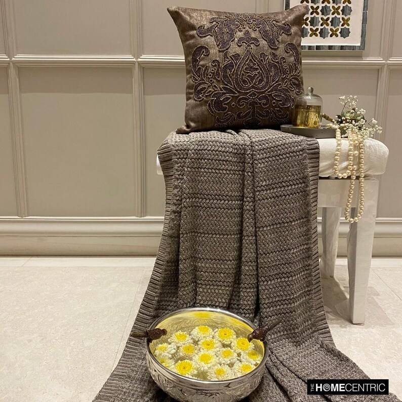 Decorative Brown Gold Throw Pillow Cover Velvet Suede Foil Pillow Cover Beaded Damask Pattern Victorian Style