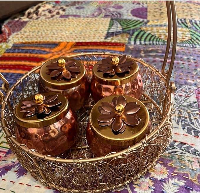 Decorative Dry Fruit Holder with Floral Lids 4 Jars Metal Basket Multipurpose Decorative Box Copper Gift Box Tabletop Home Decor