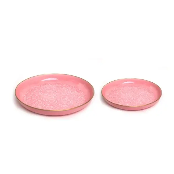 Decorative Enameled Metal Tray With Pink Powder Coating Finishing Embossed Design Round Shape Genuine Quality For Serving
