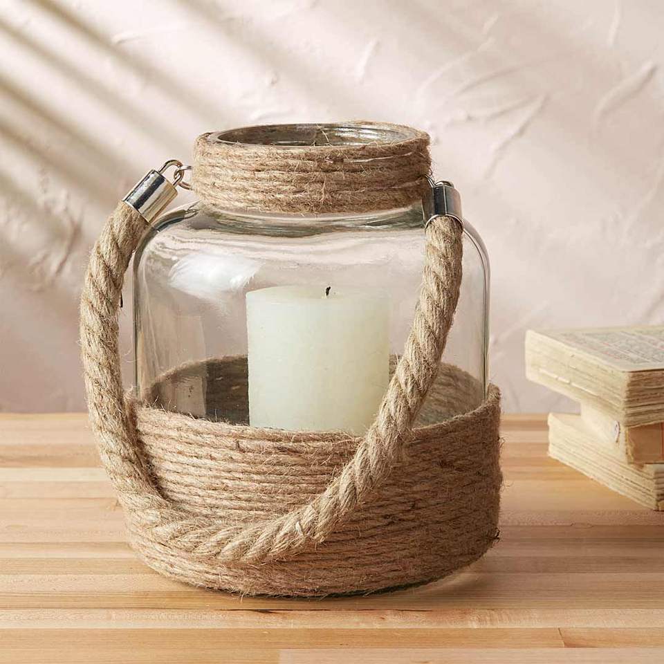Decorative Glass And Rope Lantern Handmade Artistic Hanging Candle Holder For Indoor Outdoor Home Decor