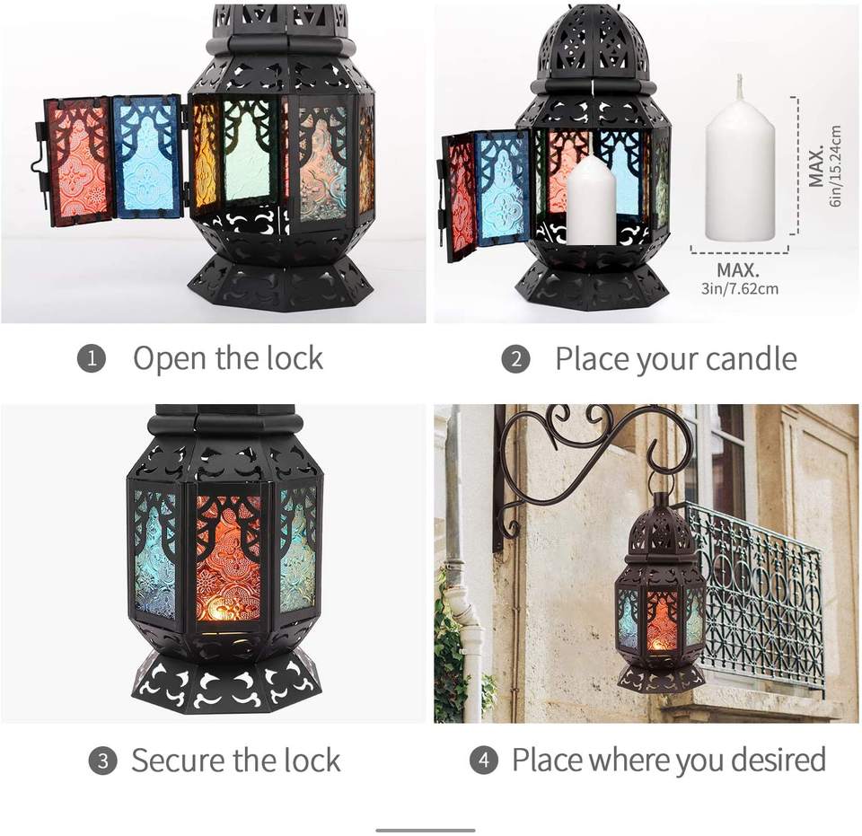 Calvin Handicraft Decorative Lantern Candle Holder Black Colorful Hanging Lamp with Polished Technique Ramadan Home Decor Gift
