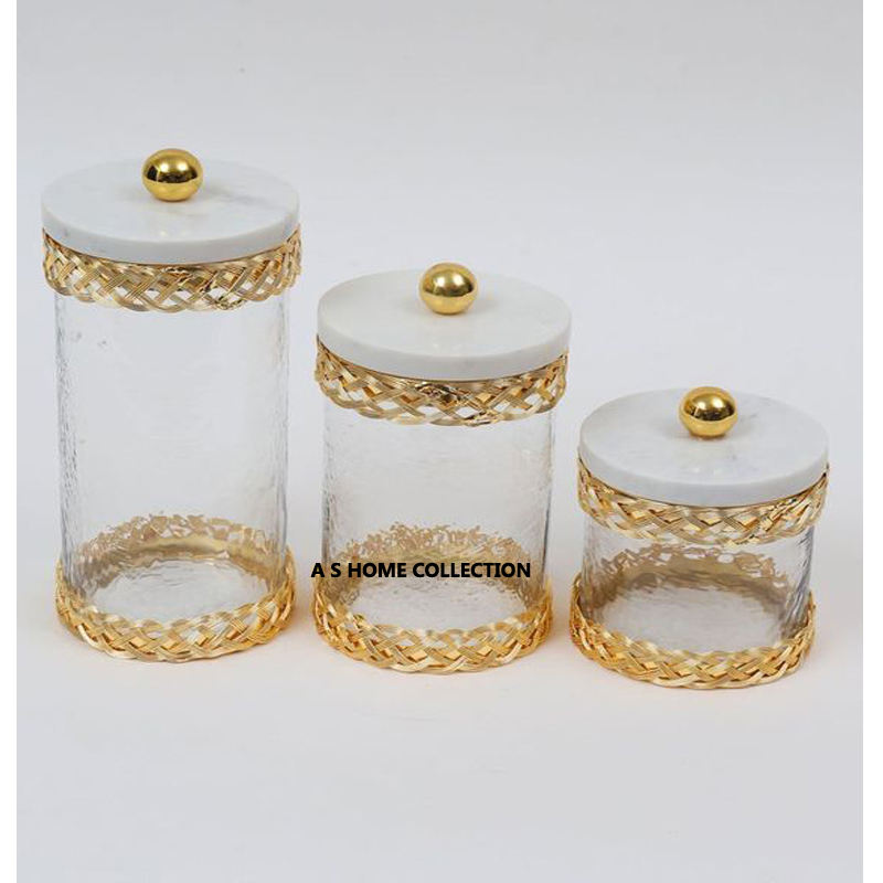 Decorative Marble Lid Kitchen Brass Leaf Metal Sugar and Candy Jar Canister With Golden Finishing for Kitchen