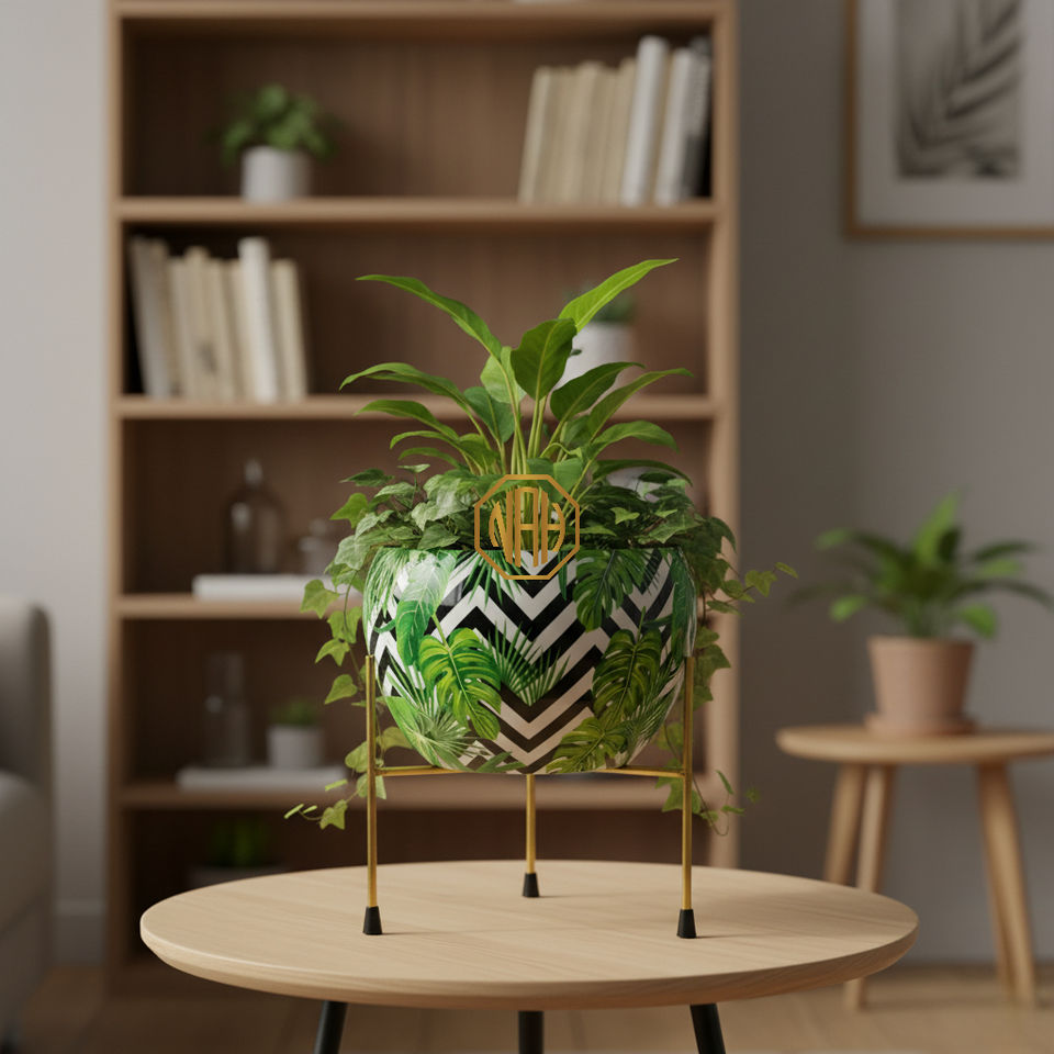 Decorative Metal Planter with Stand Indoor Outdoor Use Garden Patio Balcony Home Green Leaf Pattern Pot Export Quality