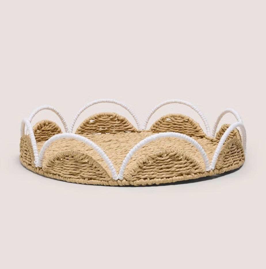 Decorative Scalloped Paper Serving Tray with White Trim, Handwoven Wicker Tray for Coffee Table Decor