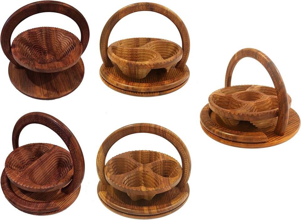 Elegant Handcrafted Wooden Fruit Basket with Carved Flower Style Collapsible and Decorative with Circular Trivet or Holder