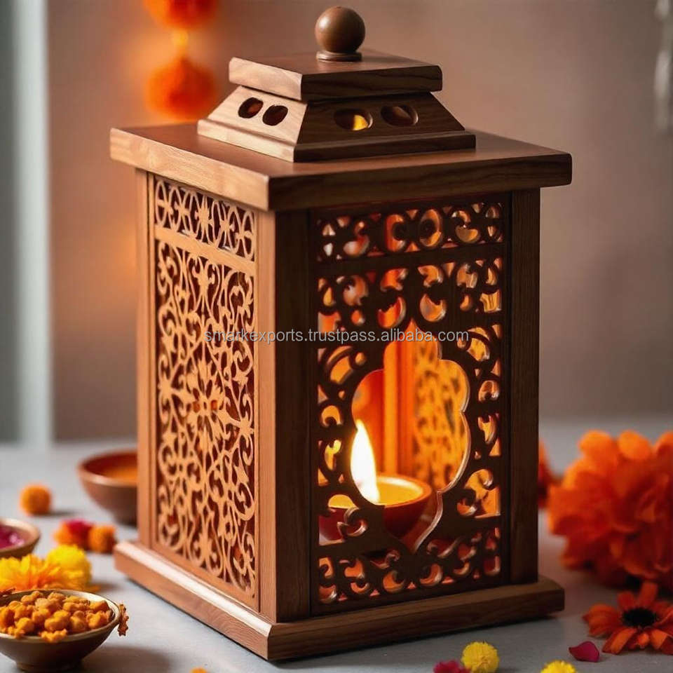 Decorative Wooden Lantern Square Shape with Detailed Carvings Ideal for Tealight Candle Holders Home Decor and Event Lighting