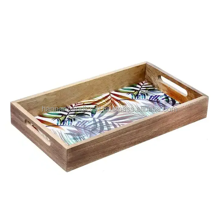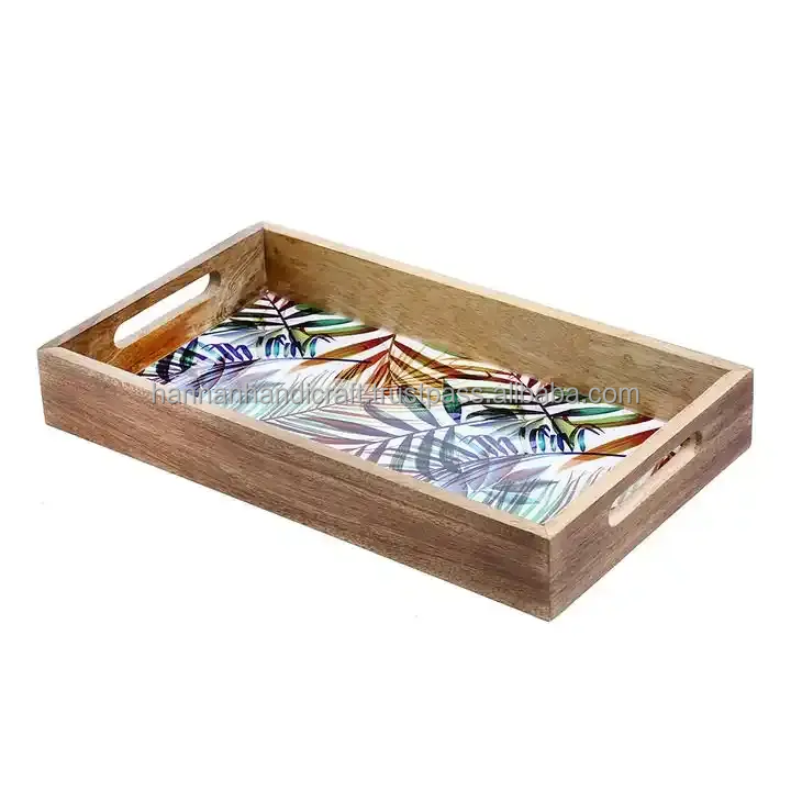 Decorative Wooden Serving Tray Set With Floral Leaf Prints Round Rectangle Clover Shaped Trays For Tea Snacks And Home Decor