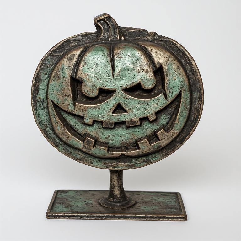 Decorative aluminium pumpkin sculpture, vintage patina polish, handmade details enhancing festive Halloween home interiors