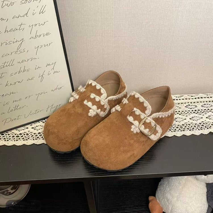 Deep Mouth Round Toe Casual Flats No Inner Lining Mid Heel(3-5cm)Platform Sole Slip-On Low-Top Rubber Suede Shoes