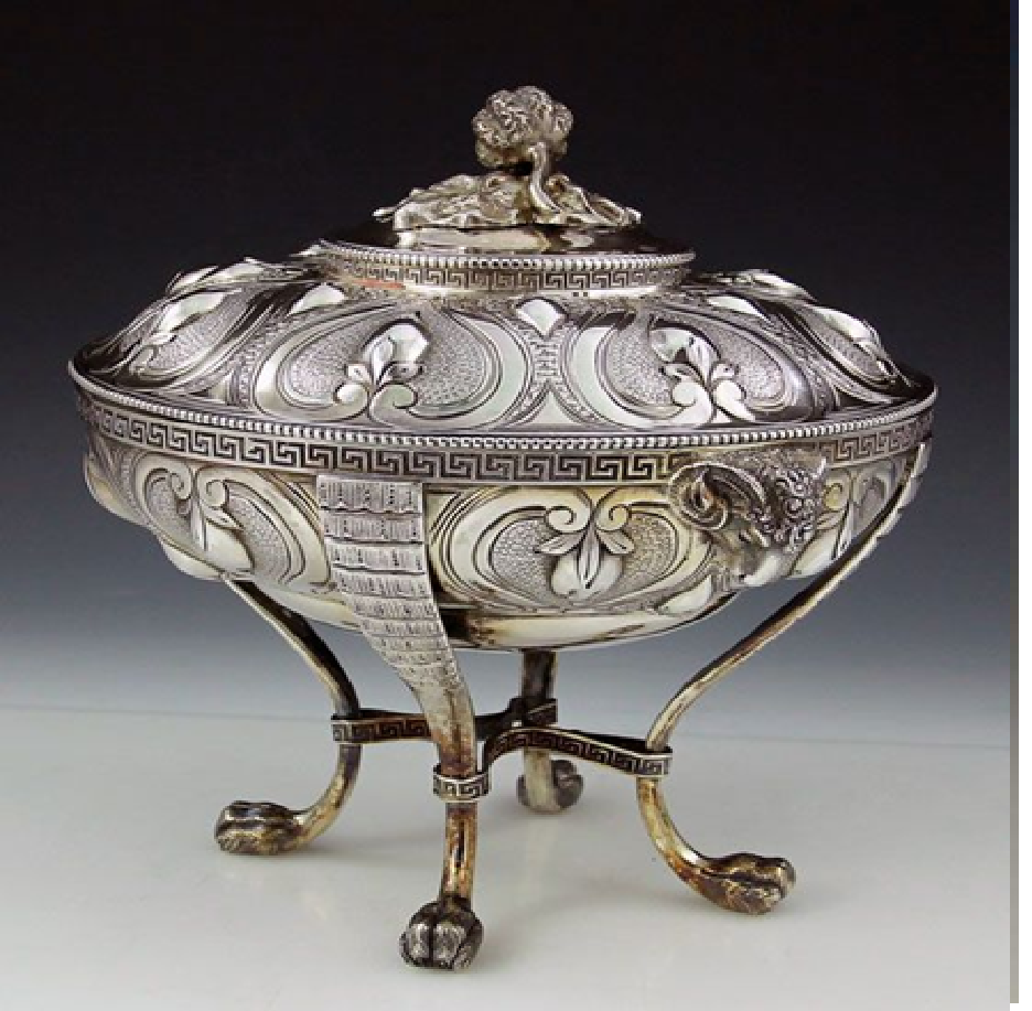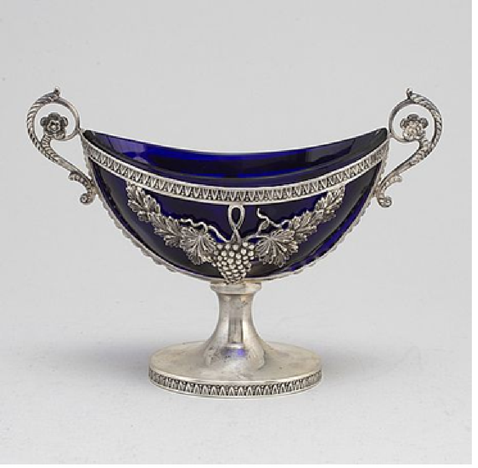 Deep green glass liner set in a silver frame with grape leaf accents and handles. Chic item available at wholesale prices.