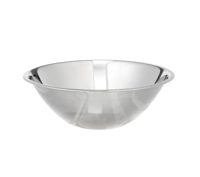 Deep stainless steel serving bowl with smooth rim for easy pouring of sauces gravies or dressings without creating a mess