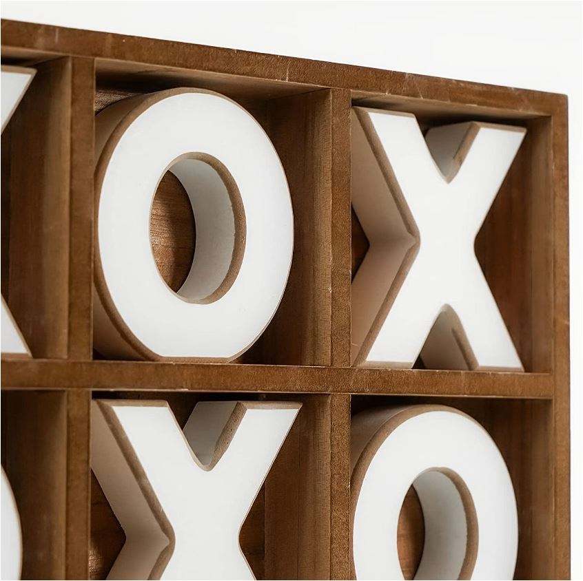 Deep wooden tic-tac-toe board with large, thick letter blocks spelling X and O. pieces are three-dimensional letters, painted