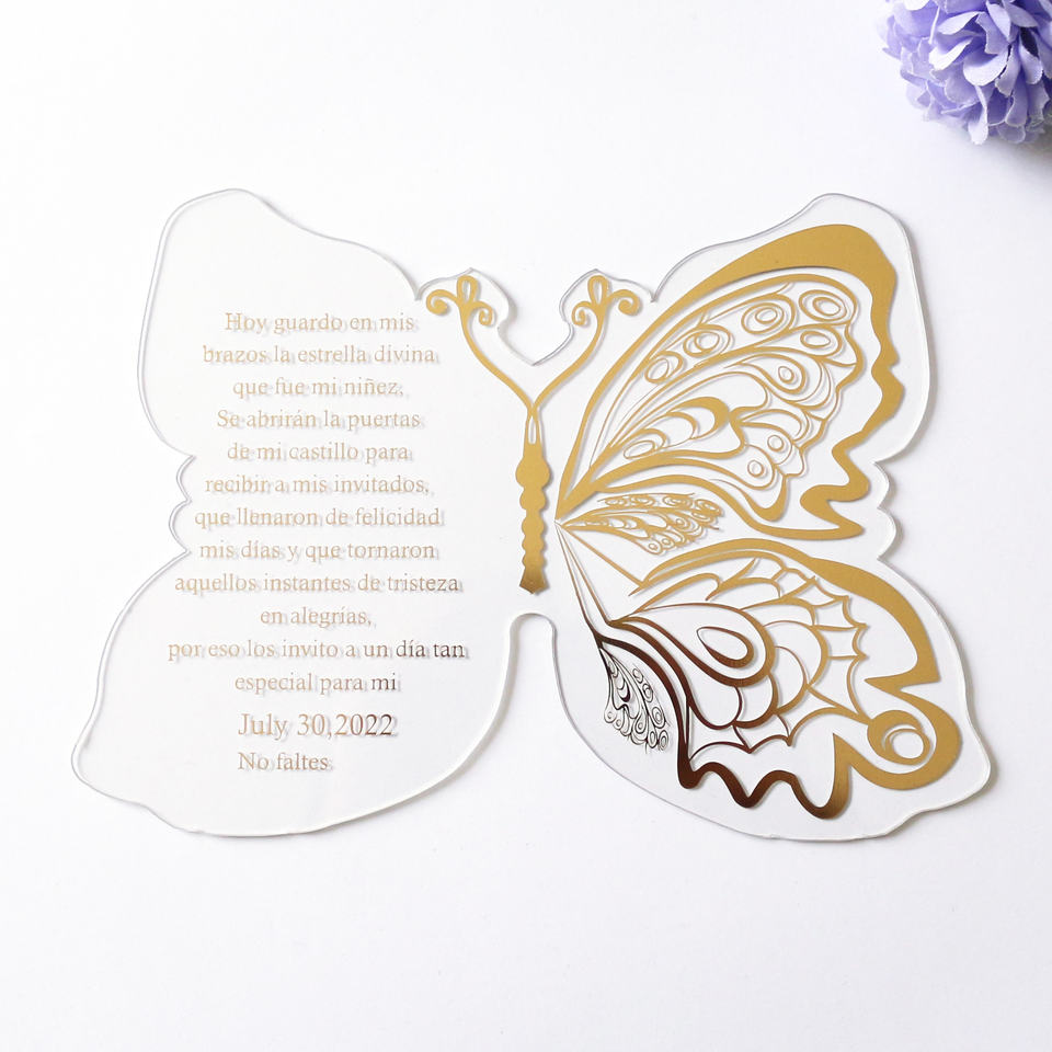 Delicate Butterfly Shaped Acrylic Cards Spanish Style Wedding Invitation Black Mirror Acrylic With One Foil Text