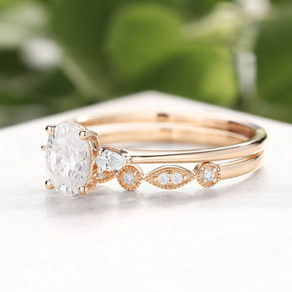 Delicate Unique S925 Rose Gold Moissanite Milgrain Bridal Set Oval Moissanite Engagement Ring Anniversary CZ Diamond Ring