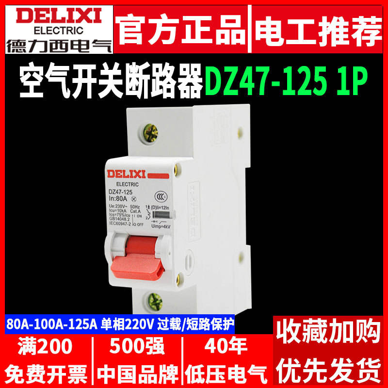 Delixi 1P Single-Phase 220V High Power Air Circuit Breaker Household DZ47-125 Single-Phase Air Circuit Breaker