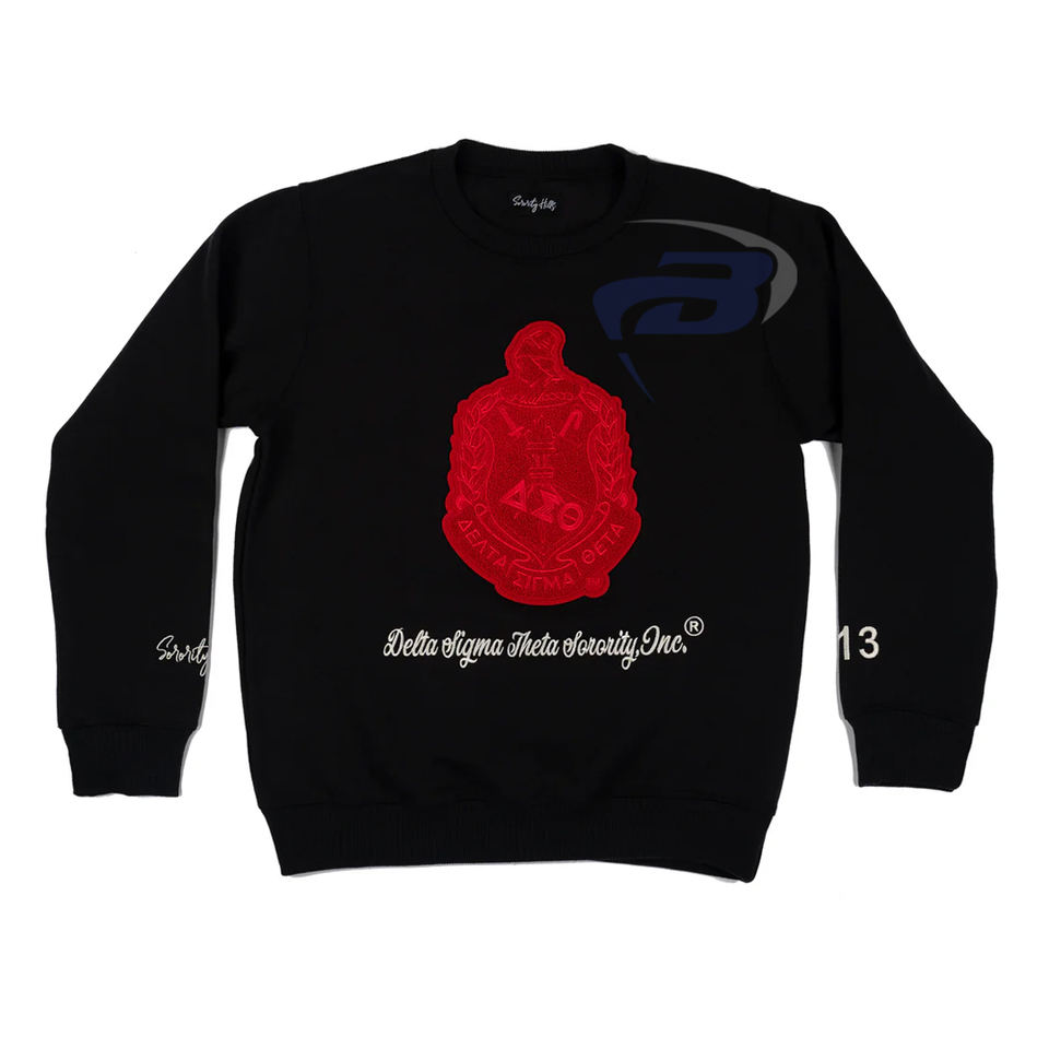 Delta Sigma Theta Sorority Winter Casual Black Chenille Custom Embroidery Cotton Fleece DST Pullover Sweatshirt with Custom Logo