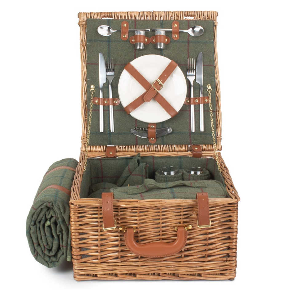 Deluxe 2-Person Fitted Wicker Picnic Basket Green Tweed-Elegant Picnic Bags