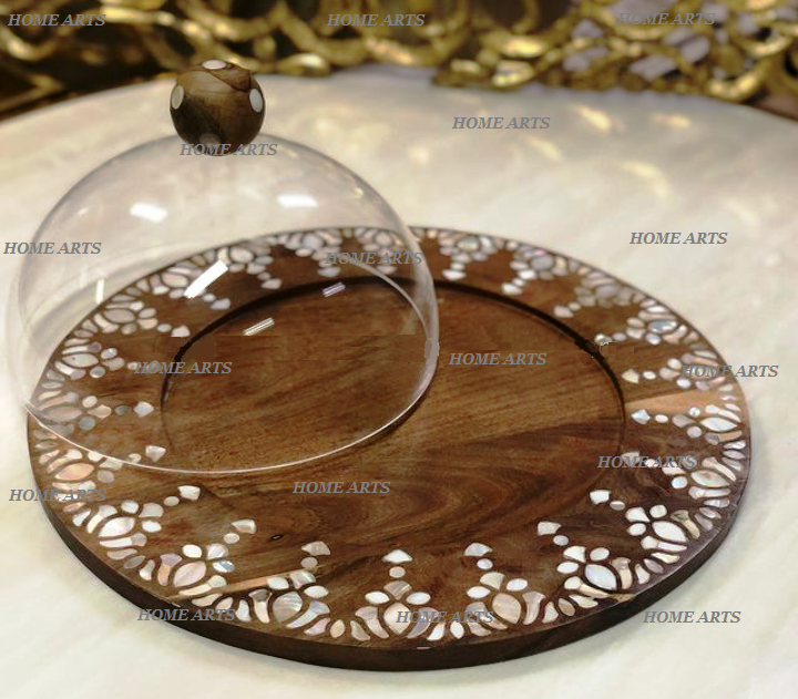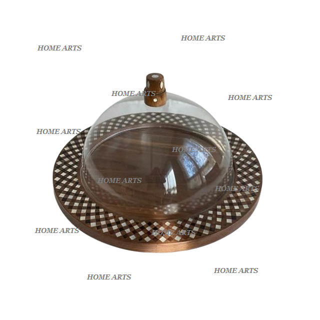 Deluxe Quality Wooden Food Tray With Acrylic Dome Trending Design Round Shape Sweets Serving Tray With Dome