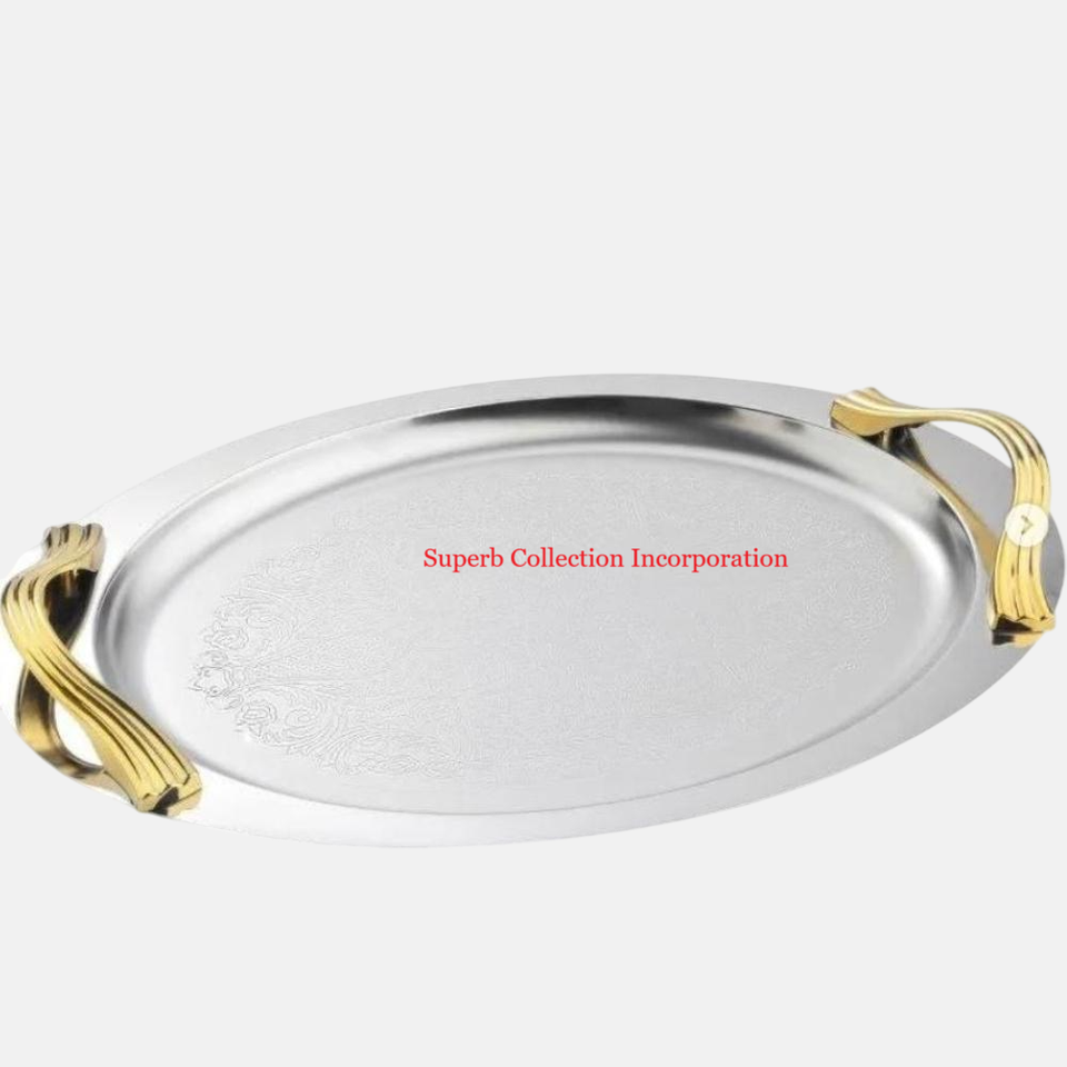 Deluxe Quality Stainless Steel Tray Classic Design Table Decor Food Serving Tray With Gold Floral Handle Cookies Serving Tray