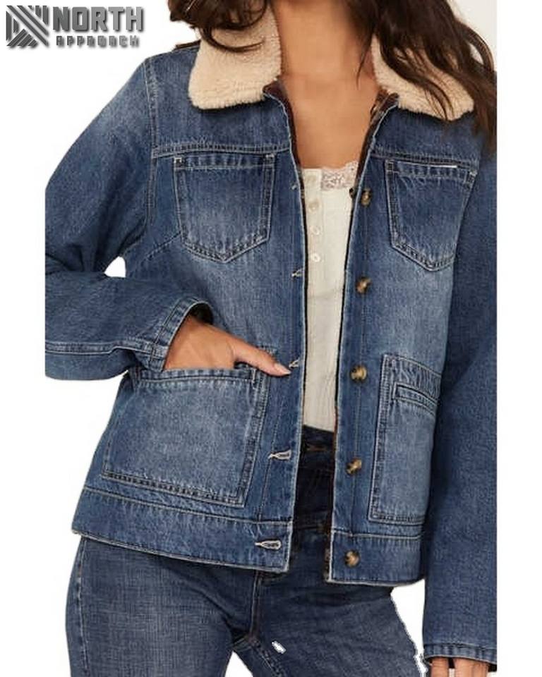 Denim Jacket Custom Embroidery Logo Vintage New Style Fleece Collar Distressed Washed Padded Women Denim Bomber Jacket
