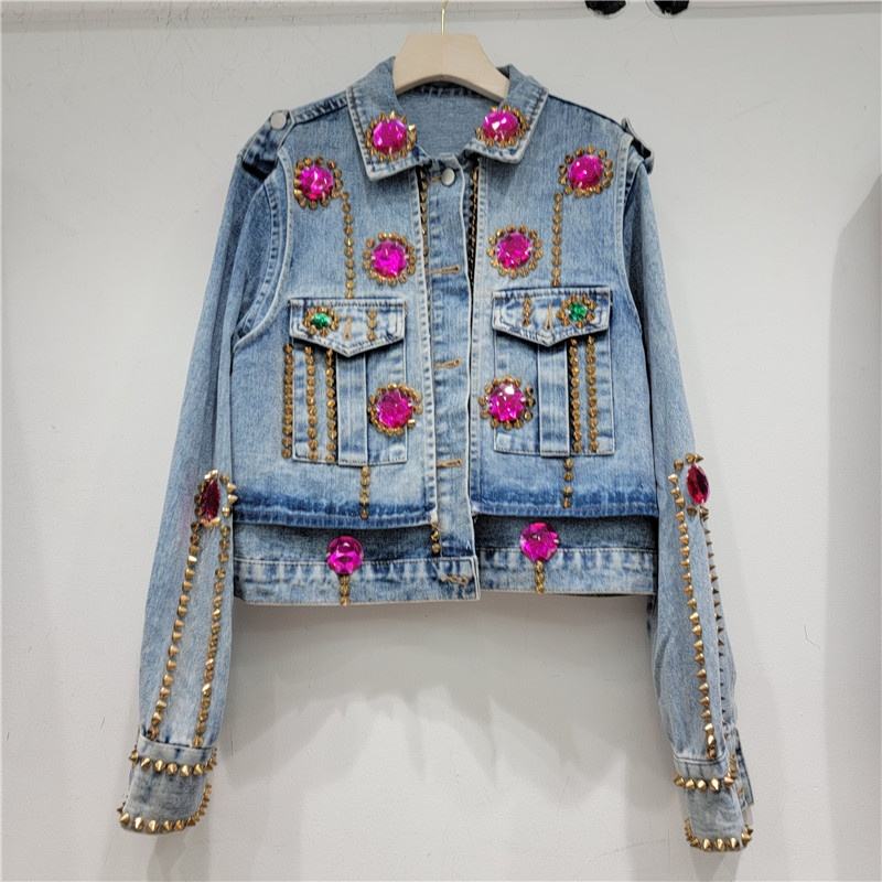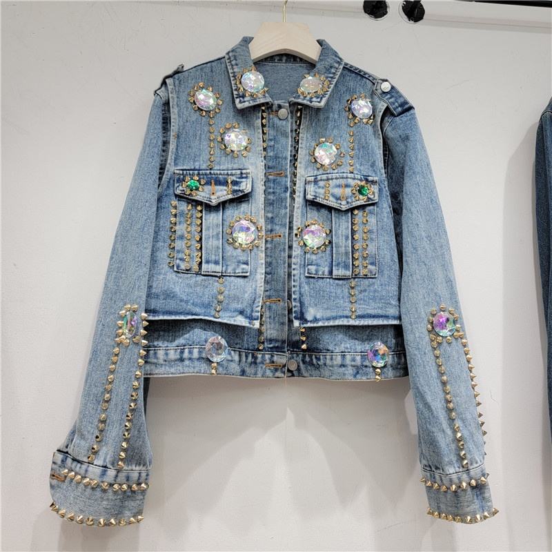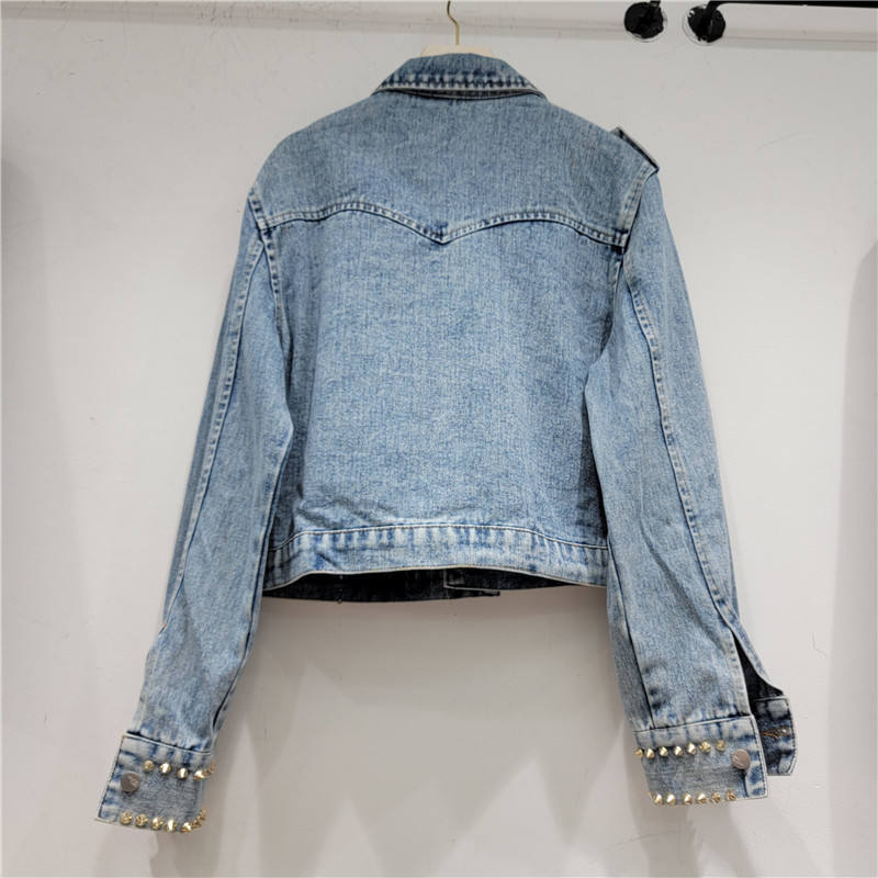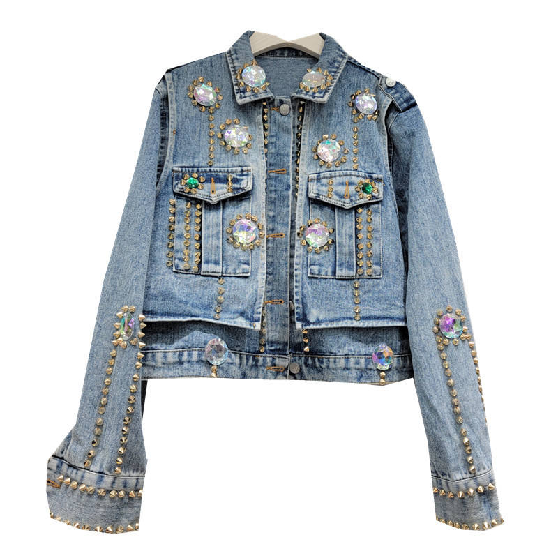 Denim Jacket With Rhinestone Beading And Studs Casual Regular Fit Short Women's Coat