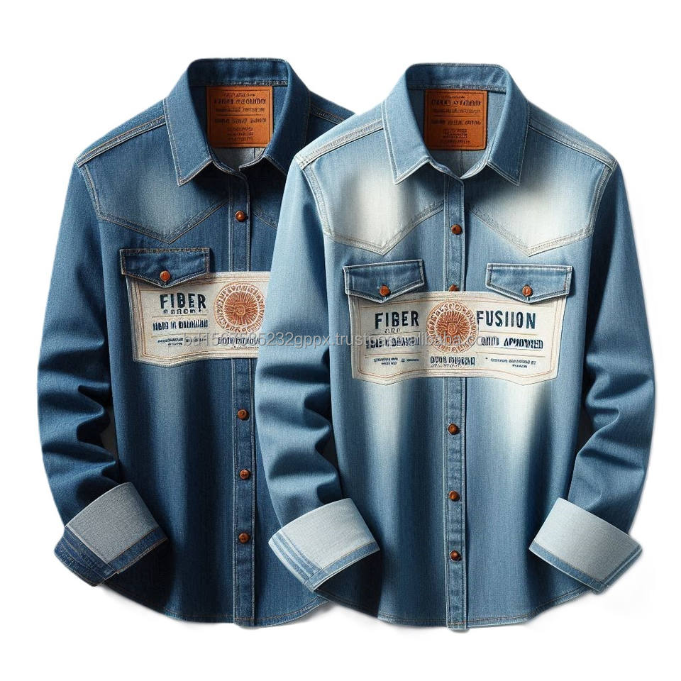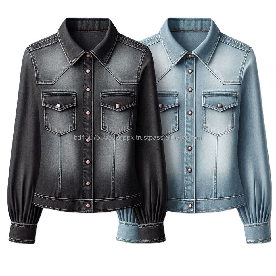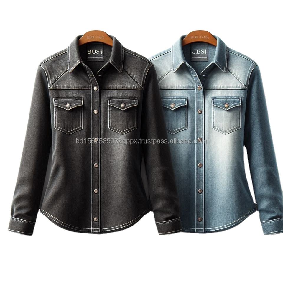 Denim Jeans Shirts for Girls, Washed Denim Fabric, Slim Fit Western Style Long Sleeve Custom Designed Shirts Made in Bangladesh