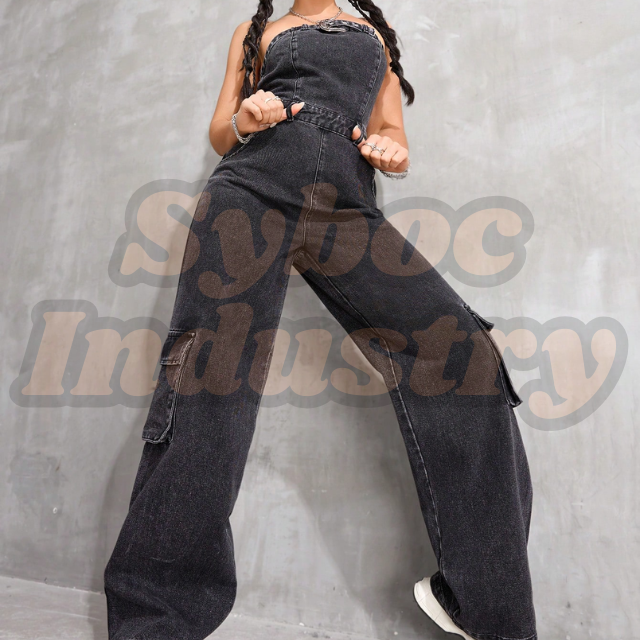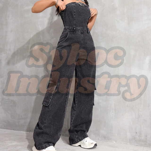 Denim Overall Dress For Women Stylish Acid Wash Black Tube Top Vintage Jumpsuit For ladies Loose Fit Casual Overall Female Dress