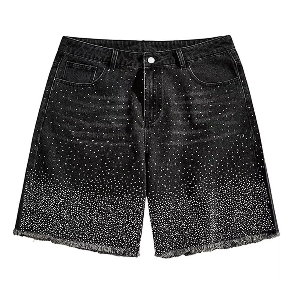 Denim Shorts Men Custom Distress Wash Raw Edges Jeans Denim Shorts Baggy Rhinestone Streetwear Custom logo denim shorts