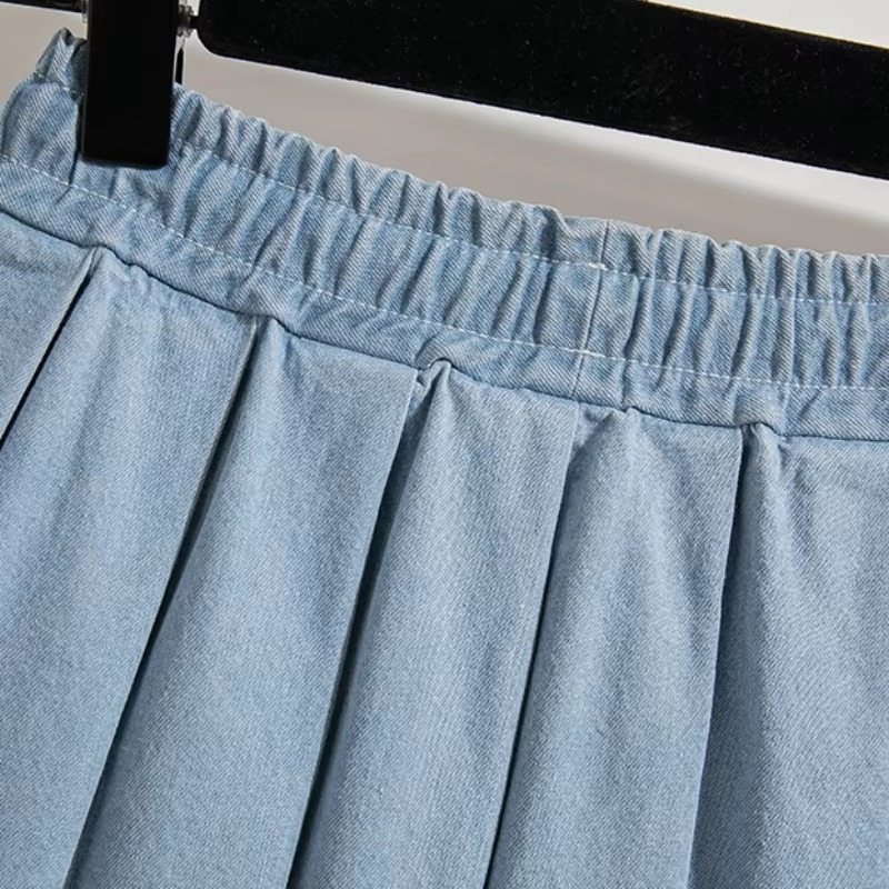 Women's Denim Mini Skirt with Lace up Pleats Elastic Waist Cute Soft Girl Frilly Loose Culotte Design Summer Autumn Fashion