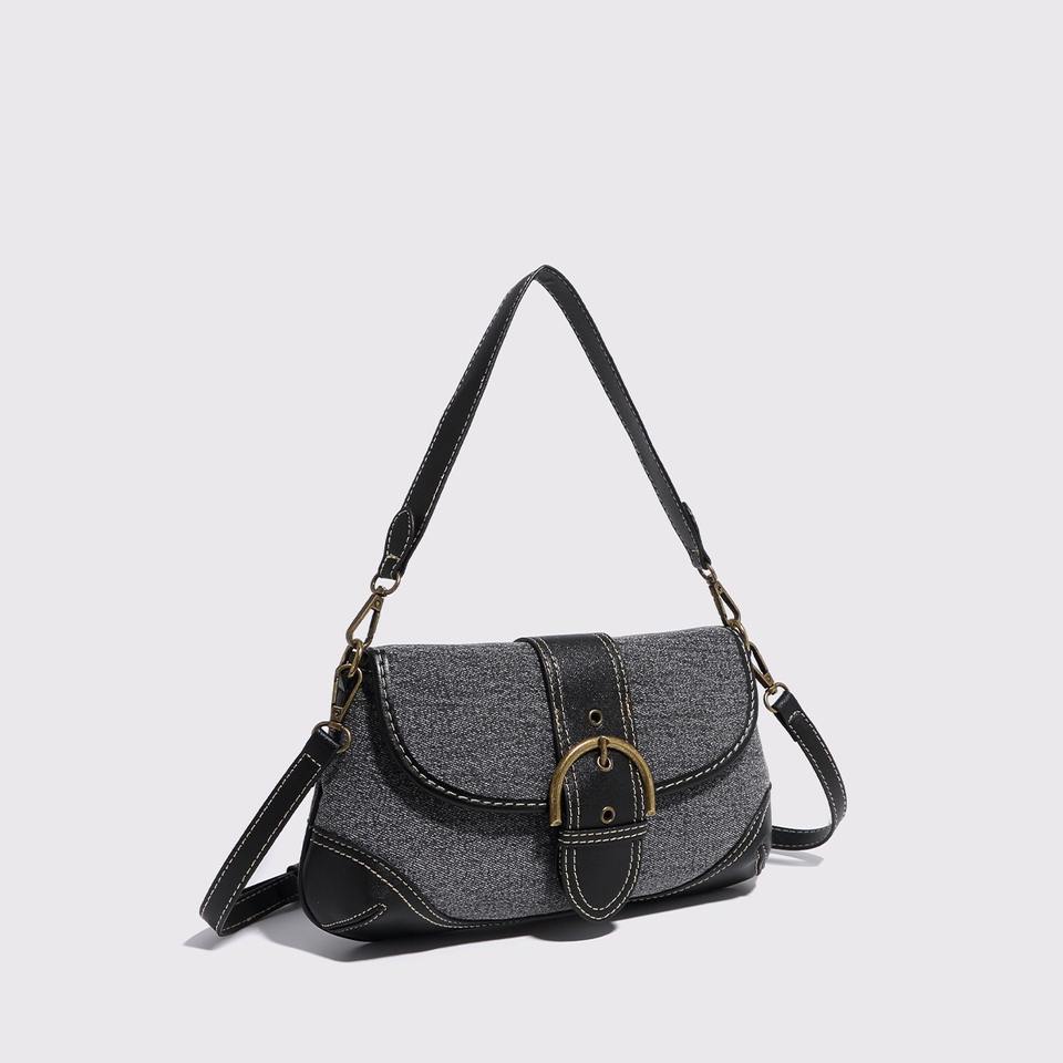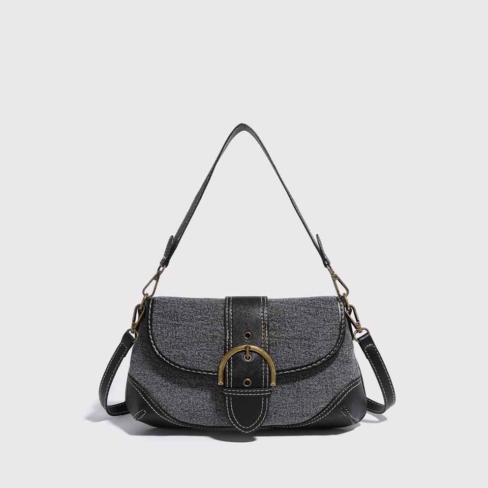 Denim patchwork shoulder bag metal buckle retro casual