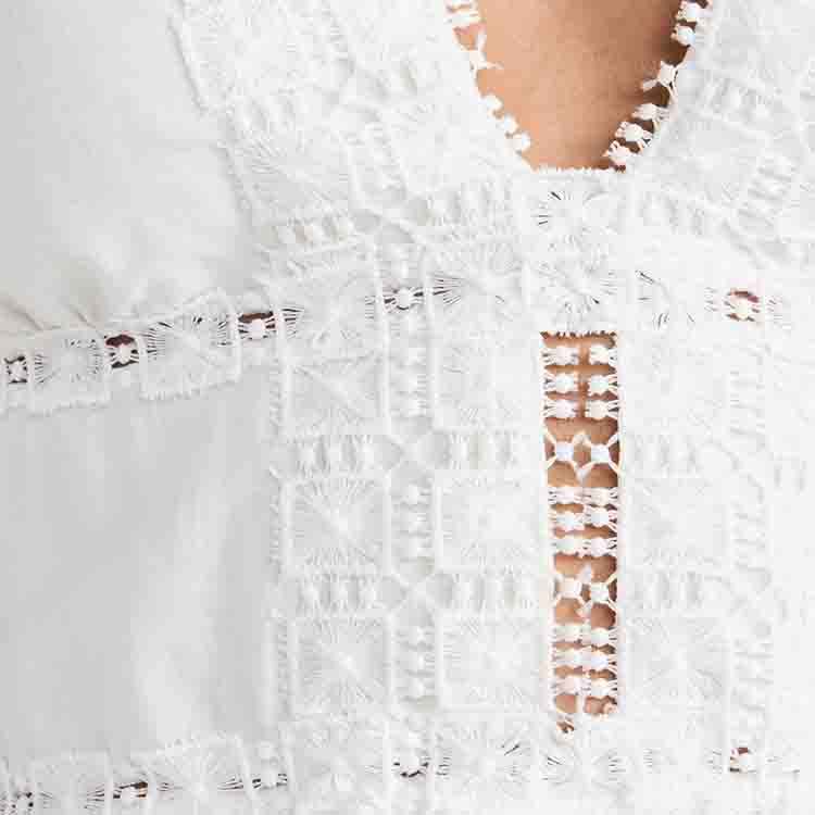 Designed deep V-neck lace-trimmed puff sleeve short embroidery dress custom 100% organic cotton mini dress