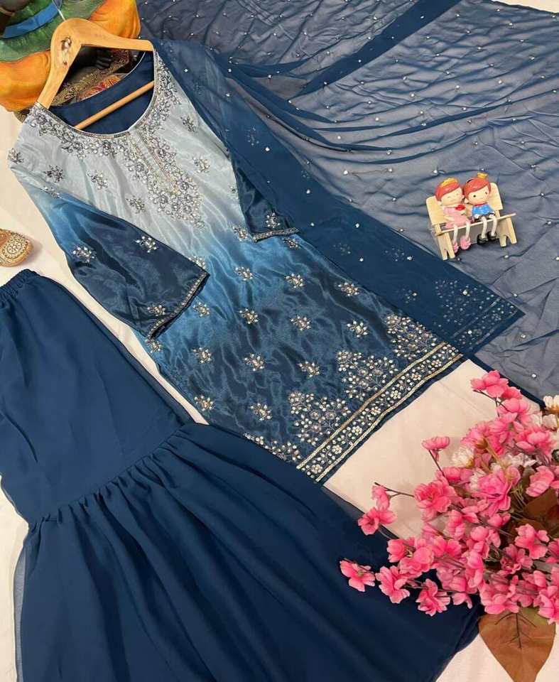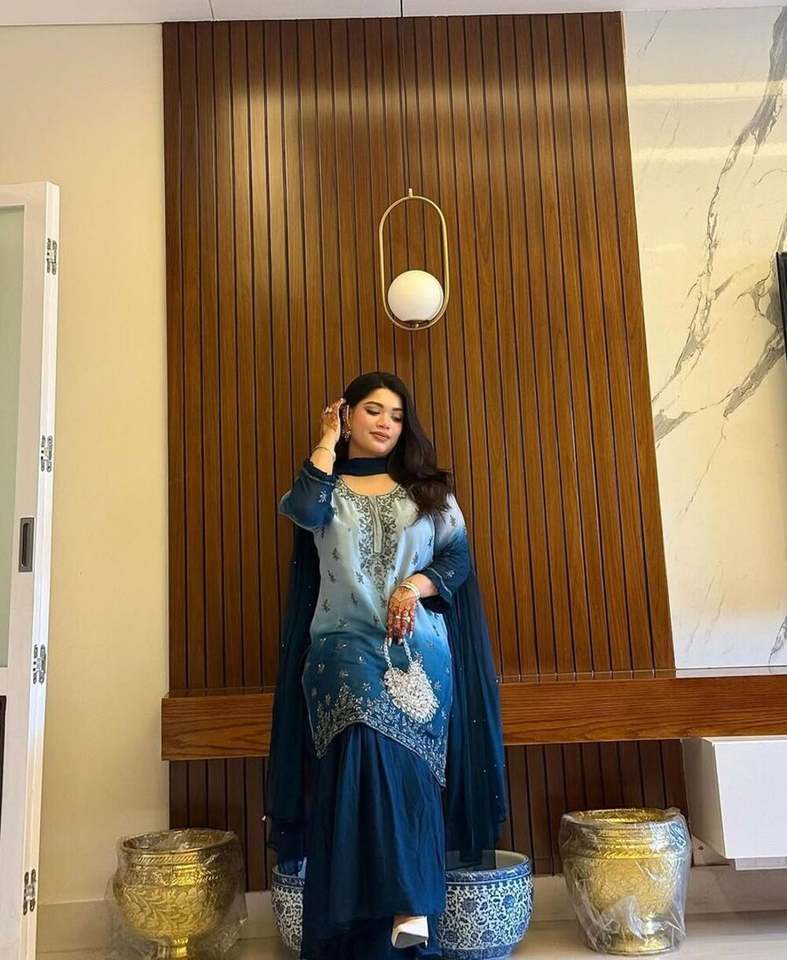 Designer Beautiful Georgette Silk Faux Fur Wool Embroidery Sequence Work Top Sharara Dupatta Party Wear Low Price Wholesale