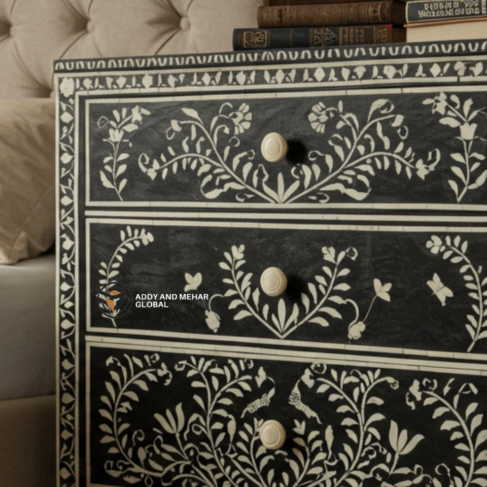 Designer Black Bone Inlay Nightstand Artistic Floral Bedside Table with Dual Drawers