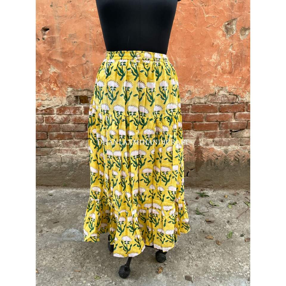 Designer Bohemian-Style Women's Cotton Maxi Skirt Yellow Floral Printed Boho Tunic Lace Long Sustainable Two-Tire Wear Fabric