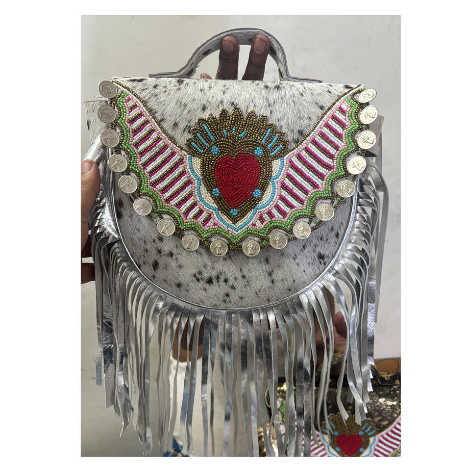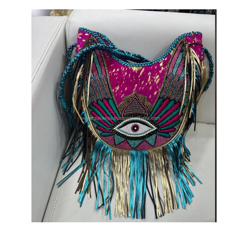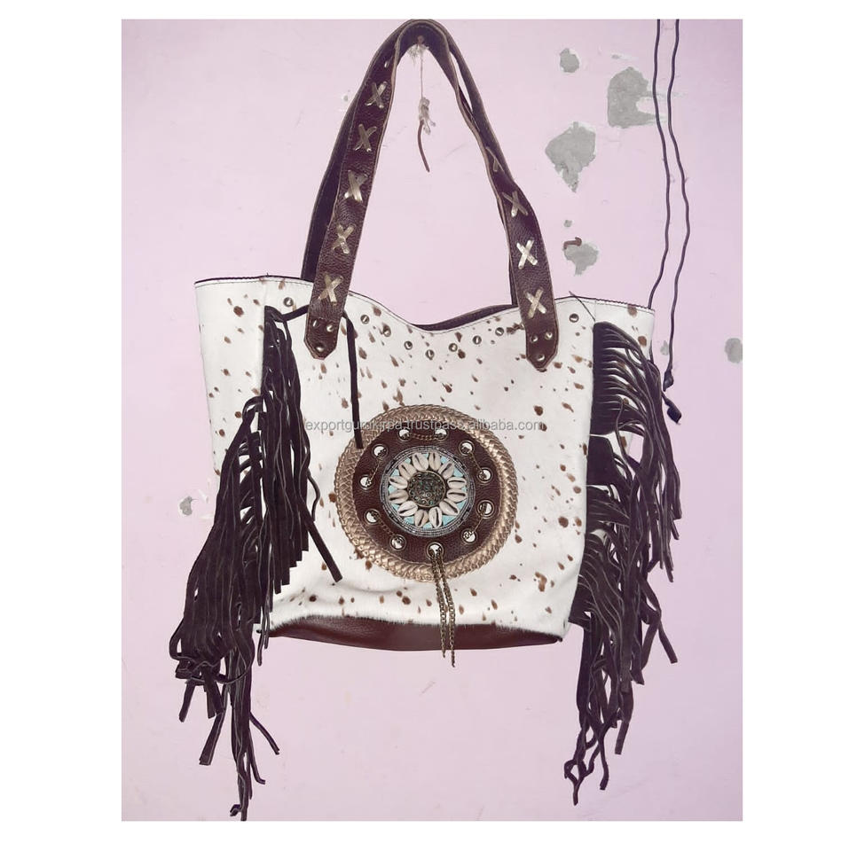 Designer Boho Cowhide Leather Women's Messenger Bag Handmade Cowgirl Shoulder Bag Zipper for Evening Shopping Indian Bohemian