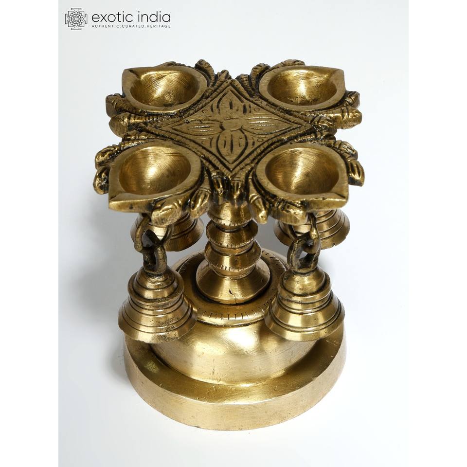 4 Inches Designer and Attractive Brass Elegant Four Wicks Oil Lamp with Bells for Home Decor, Gifting and Temple Made In India