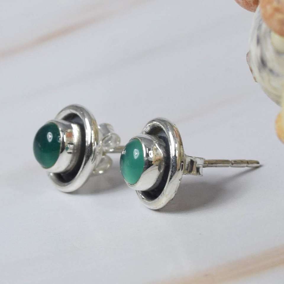 Designer Classic Women's Semi-Precious Genuine Green Onyx Gemstone Bezel Set Birthstone Stud Earrings 925 Sterling Party Gift