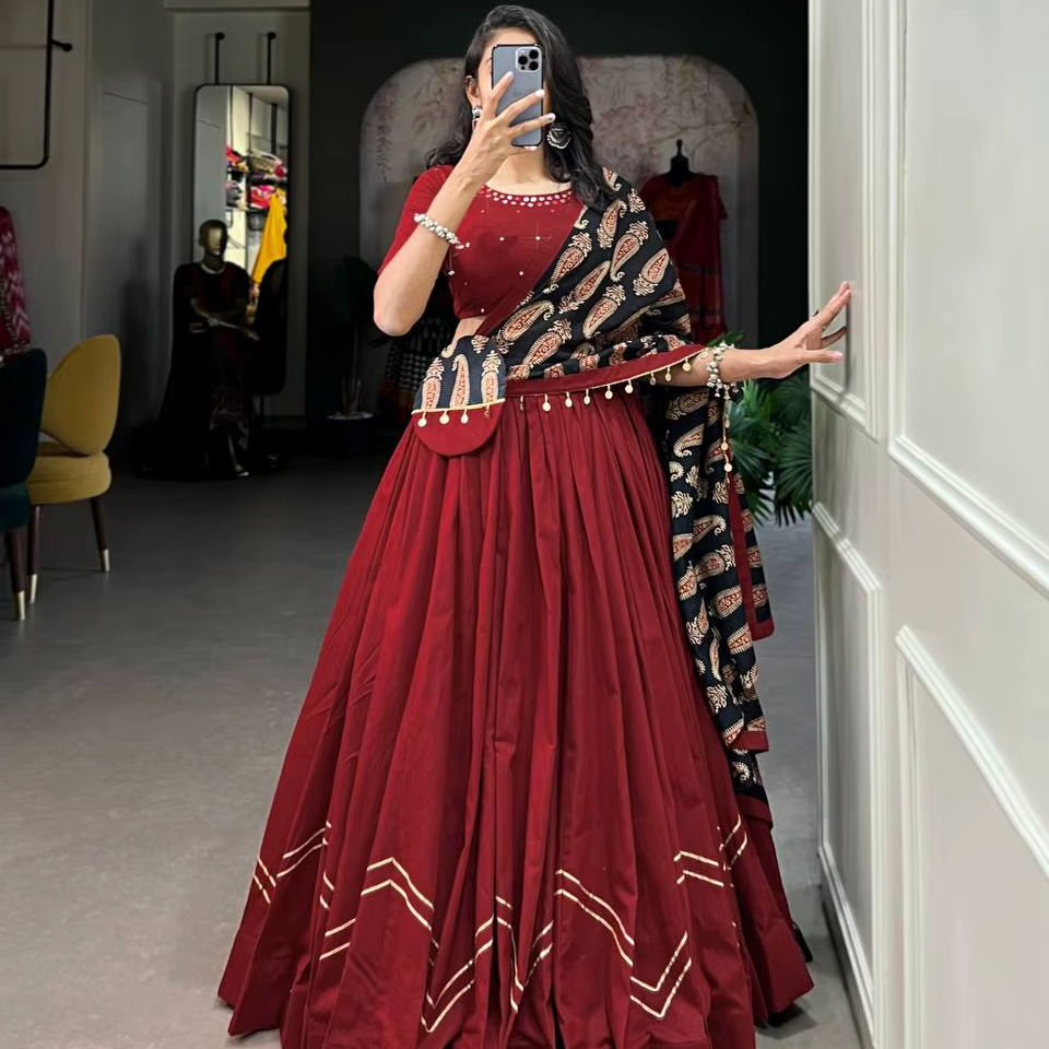 Designer Collection Pure Cotton Maroon Lehenga Choli Set Traditional for Navratri Gota Patti Touch Real Mirror Hand Work Wedding