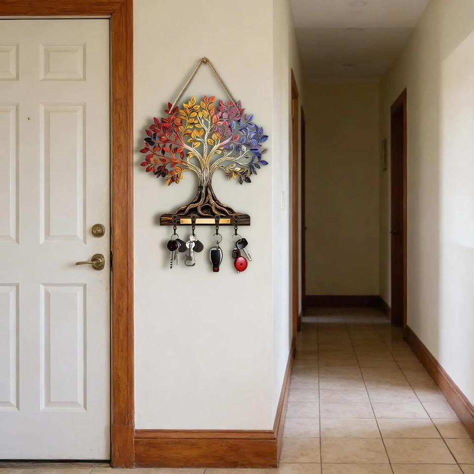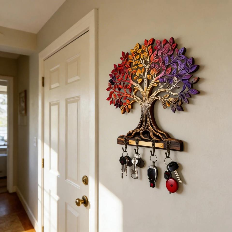 Designer Colorful Tree Pattern Wooden Key Holder Wall Mount Hook For Key Storage Entryway Decor And Organization From India
