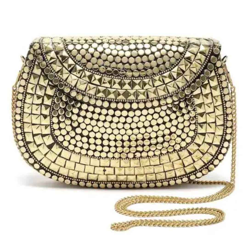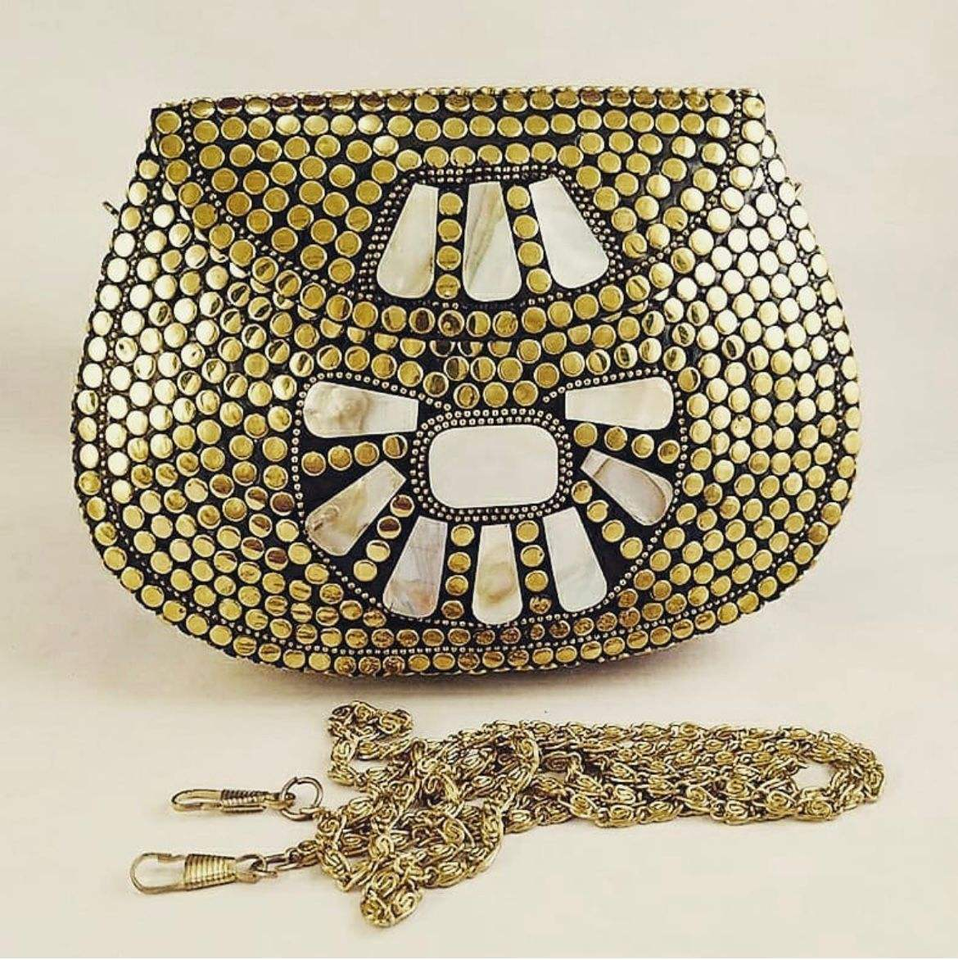 Designer Evening Clutch with Mosaic Embellished Half-Moon Pattern Leather and Crystal Metal Sequin Purse and Handbag