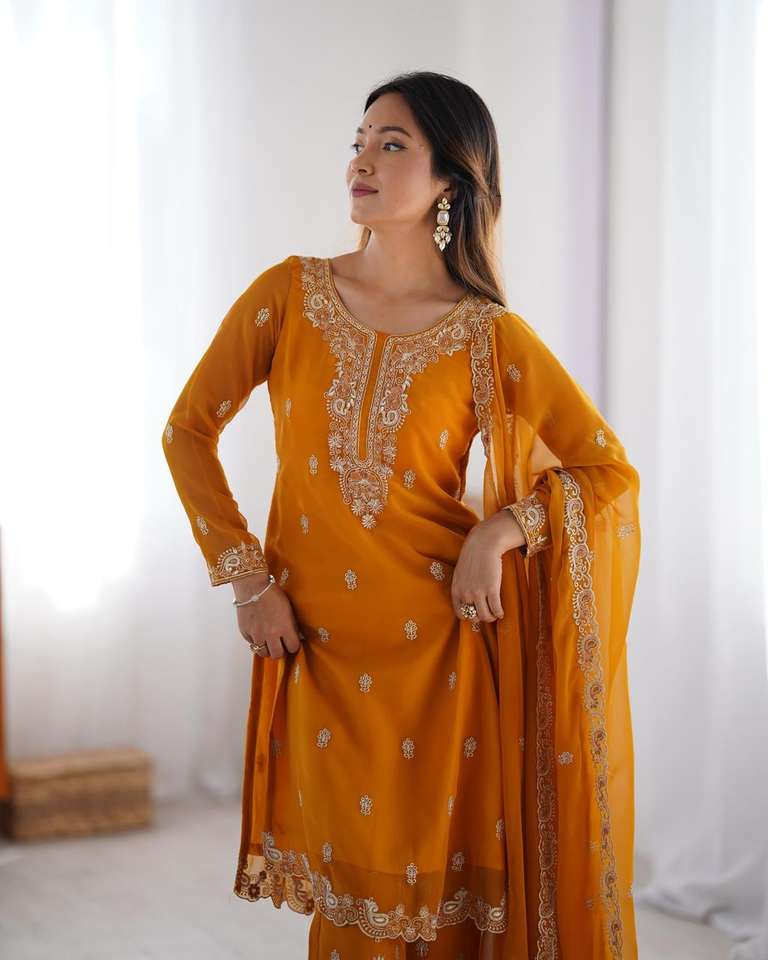 Designer Faux Georgette Thread Work Pant Suit Designer Faux Georgette Thread Work Top & Pant With Dupatta Party Festival Wear