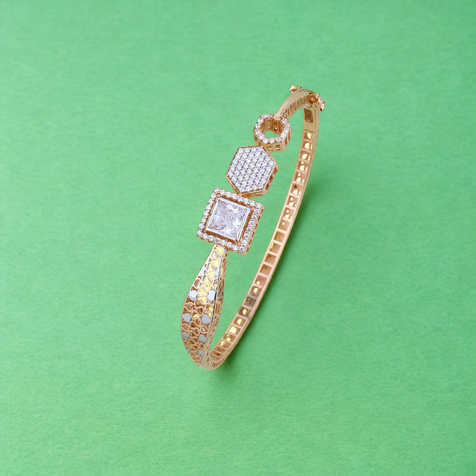 Designer Gold Diamond Bangle for Women Lightweight Filigree Pattern Square Stone Fashion Jewellery Perfect for Daily Wear
