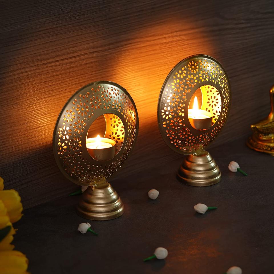 Designer Gold Metal Tealight Holder Decorative Candle Stand for Home Temple Festival Christmas Celebration