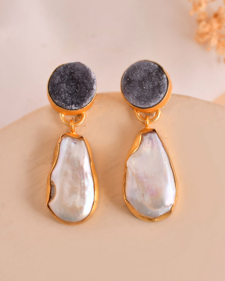 Designer Gold Plated Earring Natural Sugar Druzy with Fresh Water Pearl Stud Drops Gold Plated Wedding Fashion Jewelry