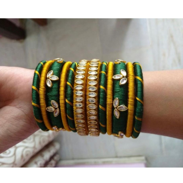 Designer Green Silk Thread Bangles Set with Gold Beads & Stone Work – Indian Wedding Bridal Bangles