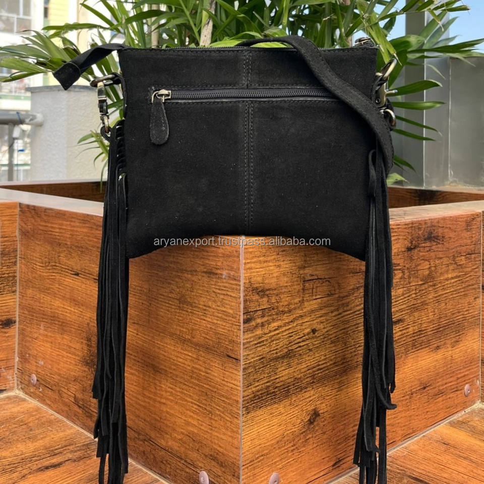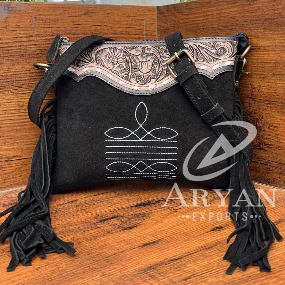 Designer Hand Tooled Black Suede Leather Boot Stitch Crossbody Fringe Bag Women's Western Genuine Leather Floral Bohemian Purses