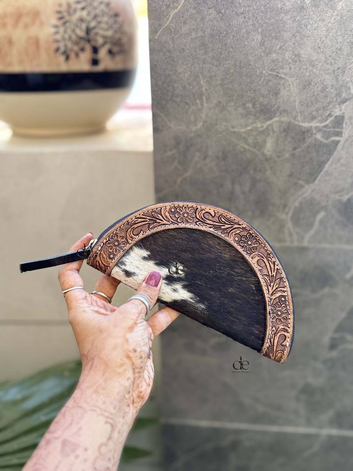 Designer Hand Tooled Carving Leather Clutch Pouch Stylish Cowhide Fur Leather Ladies Bag With Half Round Moon Shape