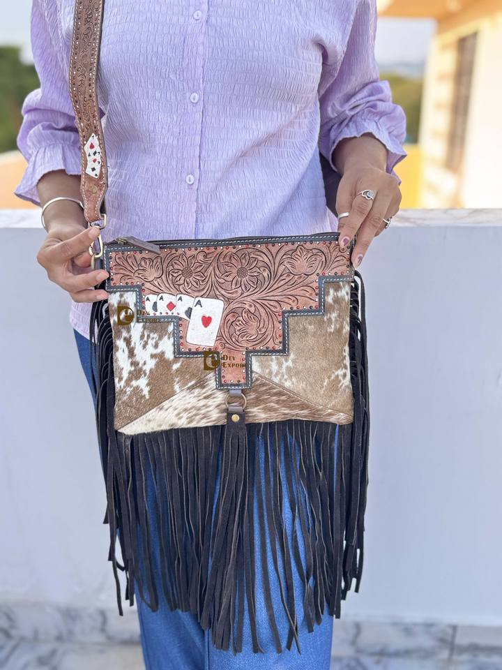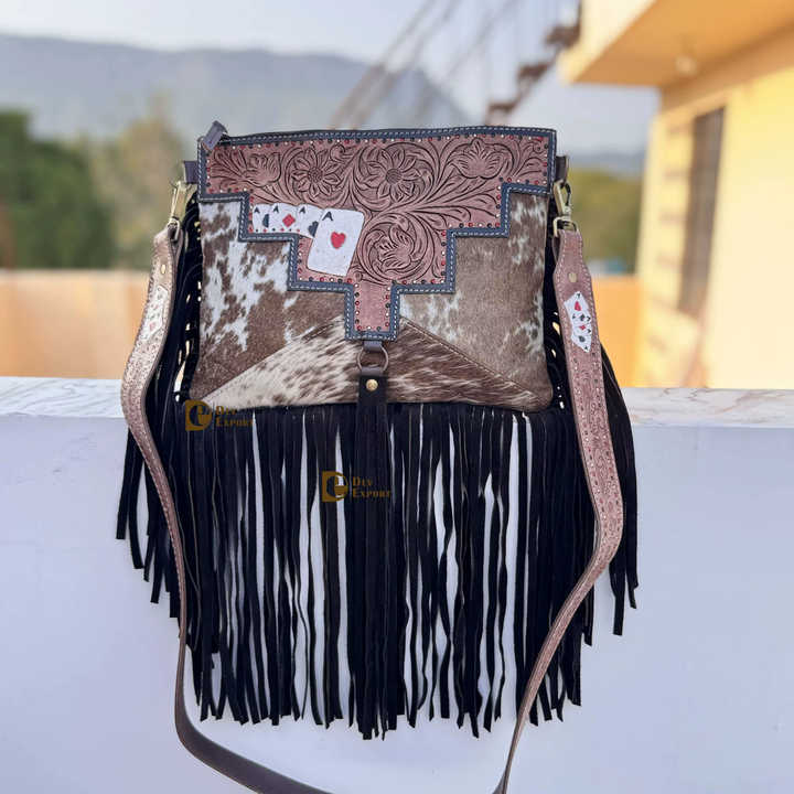 Designer Hand Tooled Carving Leather Fringe Tote Bag Hot Sale Stylish Purse Cowhide Fur Leather Bags for Women's Multi Use