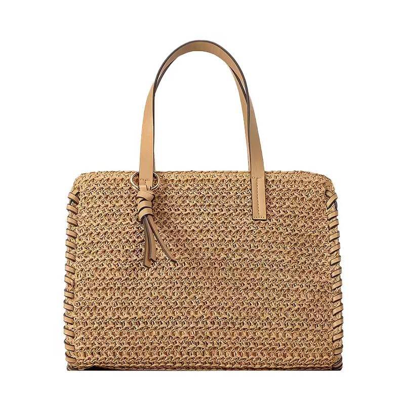 Designer Hand-Woven Straw Beach Bag Women Large Capacity Color Blocking Shoulder Tote Custom Wholesale